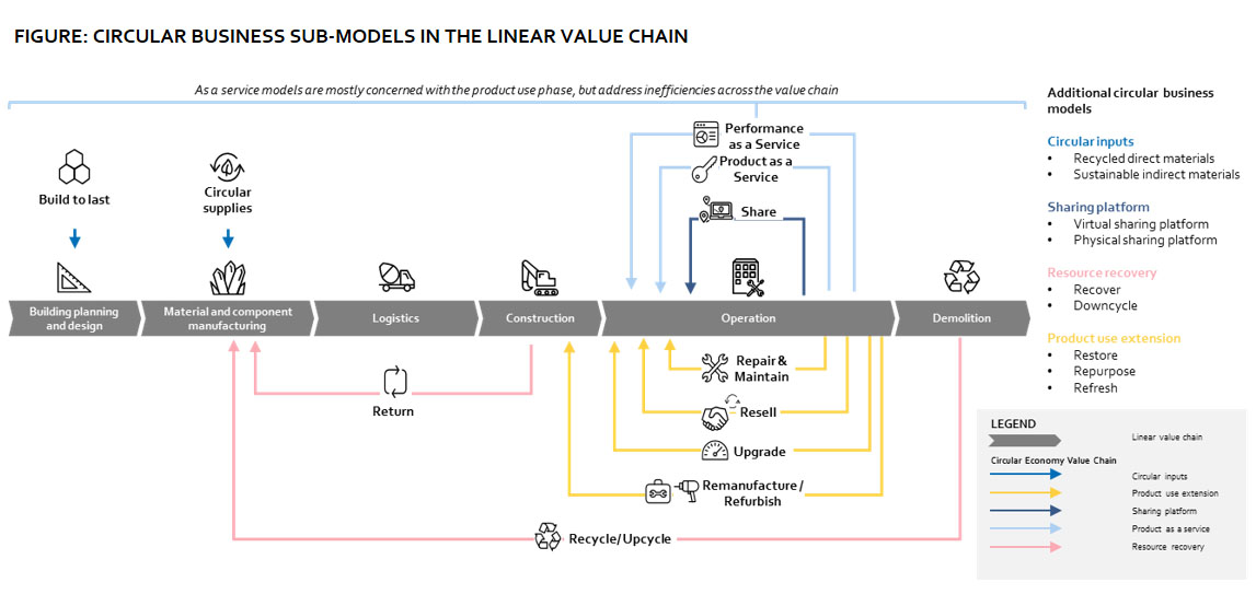 | EXAMPLE CE INITIATIVES* | Build to last - buildings are planned to be energy efficient at the operation phase and use of material banks to track material information throughout the lifecycle | Circular supplies - the end materials are made of recyclable materials and materials that are durable | N/A | Build to last - use of pre-fabricated and modular components which minimizes waste generation at the site | Product and performance as a service - selling lightning as a service instead of a product Circular supplies - smart energy management | Recycle/upcycle and return - recycle construction waste Sharing platform - re-selling of surplus material or waste material |